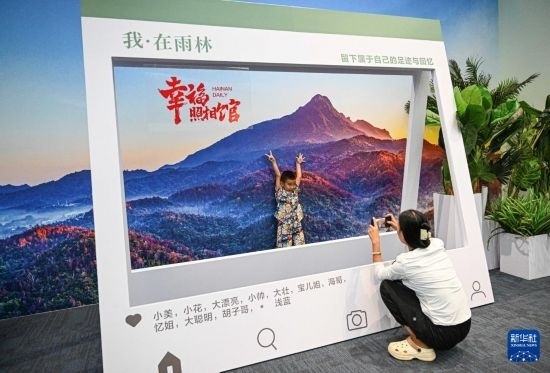 10月13日,在“守護雨林家園——海南熱帶雨林國家公園建設(shè)主題展”現(xiàn)場,觀眾與海南熱帶雨林背景墻留影。