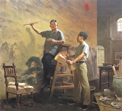 正在舉辦的第十四屆全國美術作品展覽進京作品展上,撲面而來的藝術形象是腳踏中華大地的各族人民,是中國近現(xiàn)代文化史上的先賢圣哲,是和我們一道相擁而立的堂堂中國人。這些形象剛強勇毅,如潮如云,傳遞著眾志成城的精神力量,扣動人心。譬如,呂鵬《山河頌》,以濃郁的色調(diào),再現(xiàn)傅抱石、關山月兩位前輩創(chuàng)作《江山如此多嬌》的情景,鐫刻新中國美術史上重要一幕;鄔大勇《我心中的英雄》塑造了畫家少年時代的英雄偶像——錢學森等一代科學家。還有許多氣勢宏大的創(chuàng)作,它們既是社會生活、時代精神的藝術載體,又是美術工作者面對歷史、面對人民的激情熔爐。這些作品以人民形象為根基,深植時代沃土,構成歷史與現(xiàn)實相輝映的史詩畫卷。