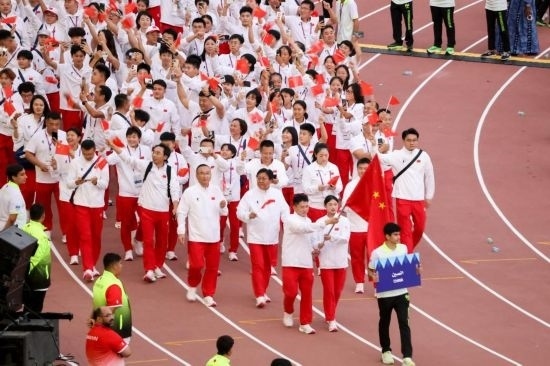 開幕式上,中國代表團第13個入場,旗手由乒乓球隊男子運動員李天陽和跆拳道隊女子運動員酈雨琪擔任。本屆運動會中國代表團共派出全國22個省區(qū)市的103名運動員參賽,其中女子運動員55人,男子運動員48人,將參加田徑、游泳、三對三籃球、沙灘排球、網球、跆拳道、國際象棋等17個大項、124個小項的比賽。