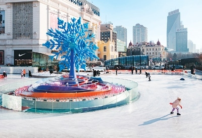 在哈爾濱市南崗區(qū)一處公益冰場,人們?cè)凇氨┲凇钡袼芘曰?/p>