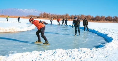 滑冰愛好者在甘肅省張掖國家濕地公園滑冰健身。