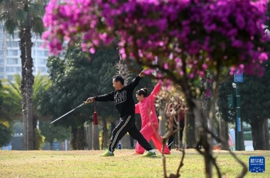 2月4日,人們?cè)趶V西南寧市南湖邊健身。
