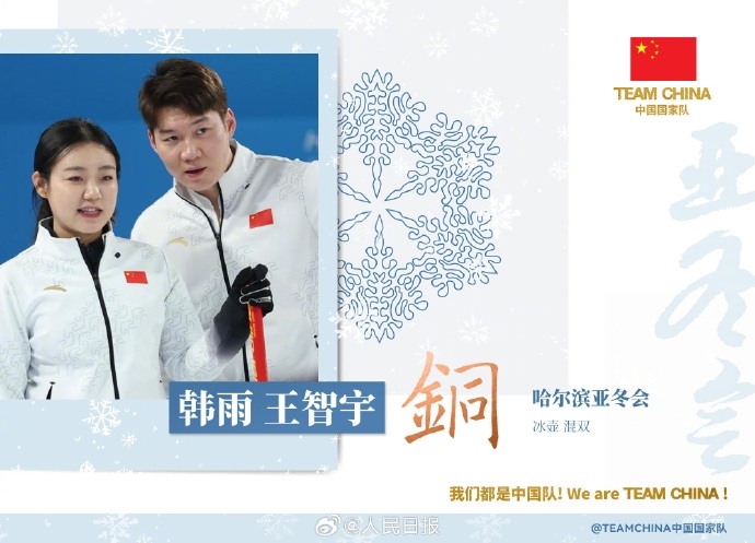 北京時間2月8日,哈爾濱亞冬會冰壺項目混雙決賽,中國隊組合韓雨/王智宇在與菲律賓隊的銅牌賽角逐中獲勝,收獲一枚銅牌,這是本屆亞冬會中國隊的首枚獎牌。