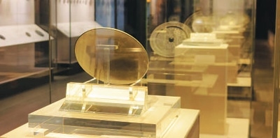 安徽蚌埠市博物館展出的漢代銅鏡。透過(guò)這枚銅鏡當(dāng)前的狀況,依稀能見到過(guò)去鏡面光可鑒人的效果。