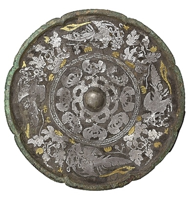 在金銀交相輝映下,這面銅鏡時(shí)至今日依然流光溢彩,其奧秘就在于“金銀平脫”工藝。即用金銀薄片裁成紋樣,粘貼于銅器漆面上,周邊再用漆涂滿,經(jīng)研磨拋光再鏨花,形成富麗堂皇、精麗雅致的藝術(shù)效果。它從最早出現(xiàn)于商代的金銀箔貼花技術(shù)演變而來(lái),后經(jīng)歷了戰(zhàn)國(guó)、漢代較長(zhǎng)時(shí)期的發(fā)展。到了唐代,工匠將“金銀平脫”創(chuàng)造性地運(yùn)用在銅鏡之上。