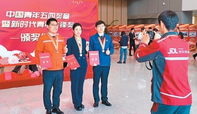 2025年4月30日,中國(guó)青年五四獎(jiǎng)?wù)卖咝聲r(shí)代青年先鋒獎(jiǎng)?lì)C獎(jiǎng)儀式在京舉行。趙亞杰(中)在頒獎(jiǎng)現(xiàn)場(chǎng)合影留念,拍攝照片的是快遞小哥欒玉帥,他也獲得了2025年度中國(guó)青年五四獎(jiǎng)?wù)隆?/p>