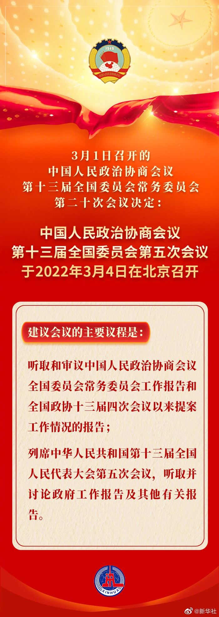 3月1日召開的中國(guó)人民政治協(xié)商會(huì)議第十三屆全國(guó)委員會(huì)常務(wù)委員會(huì)第二十次會(huì)議決定:中國(guó)人民政治協(xié)商會(huì)議第十三屆全國(guó)委員會(huì)第五次會(huì)議于2022年3月4日在北京召開。建議會(huì)議的主要議程是:聽取和審議中國(guó)人民政治協(xié)商會(huì)議全國(guó)委員會(huì)常務(wù)委員會(huì)工作報(bào)告和全國(guó)政協(xié)十三屆四次會(huì)議以來(lái)提案工作情況的報(bào)告;列席中華人民共和國(guó)第十三屆全國(guó)人民代表大會(huì)第五次會(huì)議,聽取并討論政府工作報(bào)告及其他有關(guān)報(bào)告。