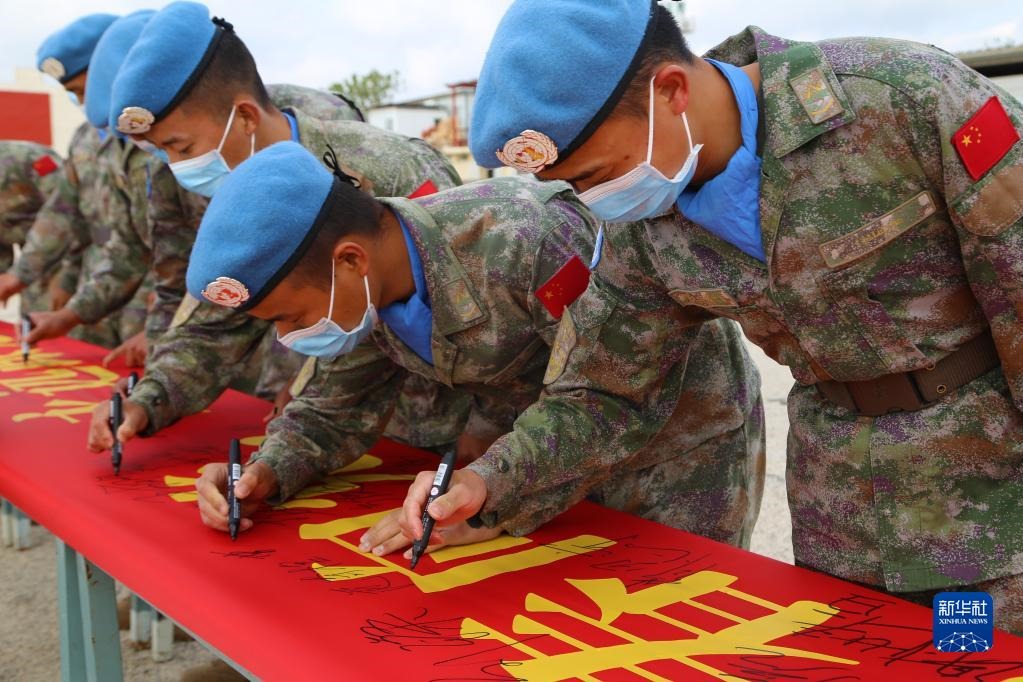 5月1日,在黎巴嫩南部提爾市沙馬村的中國(guó)維和營(yíng)區(qū),中國(guó)第20批赴黎巴嫩維和建筑工兵分隊(duì)的官兵們?cè)跈M幅上簽字。新華社發(fā)(莊小好 攝)