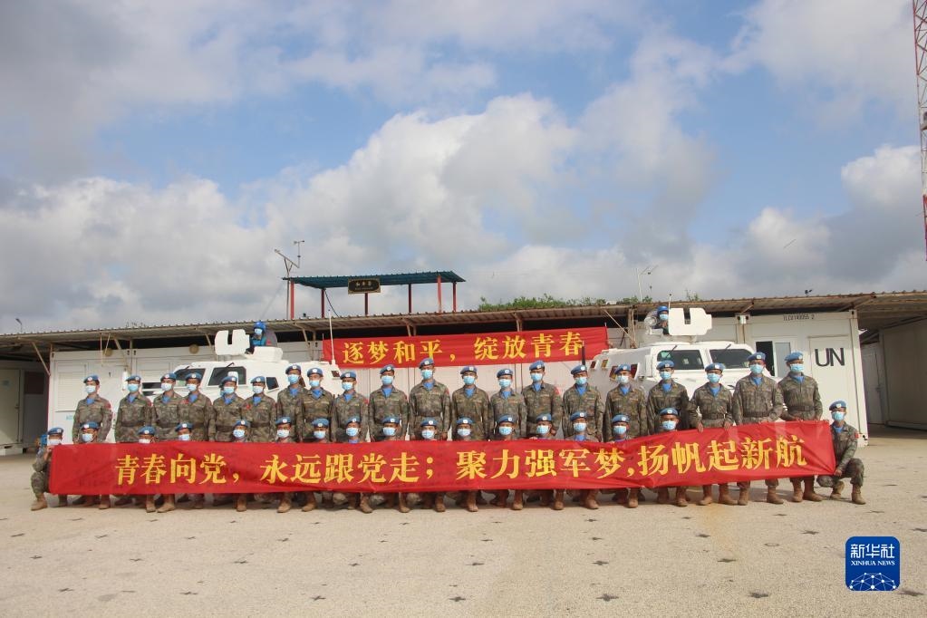 “我宣誓:忠于黨,忠于社會(huì)主義,忠于祖國(guó),忠于人民……揚(yáng)藍(lán)盔精神,展大國(guó)形象,為祖國(guó)爭(zhēng)光,為軍旗添彩?!敝袊?guó)共產(chǎn)主義青年團(tuán)成立100周年之際,在黎巴嫩南部提爾市沙馬村的中國(guó)維和營(yíng)區(qū),中國(guó)第20批赴黎巴嫩維和建筑工兵分隊(duì)的官兵們頭戴貝雷帽,身穿配有五星紅旗臂章的星空迷彩服,擺成數(shù)字“100”的隊(duì)形,面向國(guó)旗和聯(lián)合國(guó)旗莊嚴(yán)宣誓。
