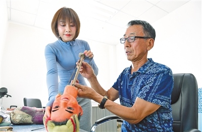 靳媛在原呼和浩特市玉泉區(qū)木偶劇團演員張曉紅(右)指導下修復(fù)木偶。