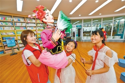 靳媛指導小學生學習杖頭木偶戲的操縱?! ?/p>