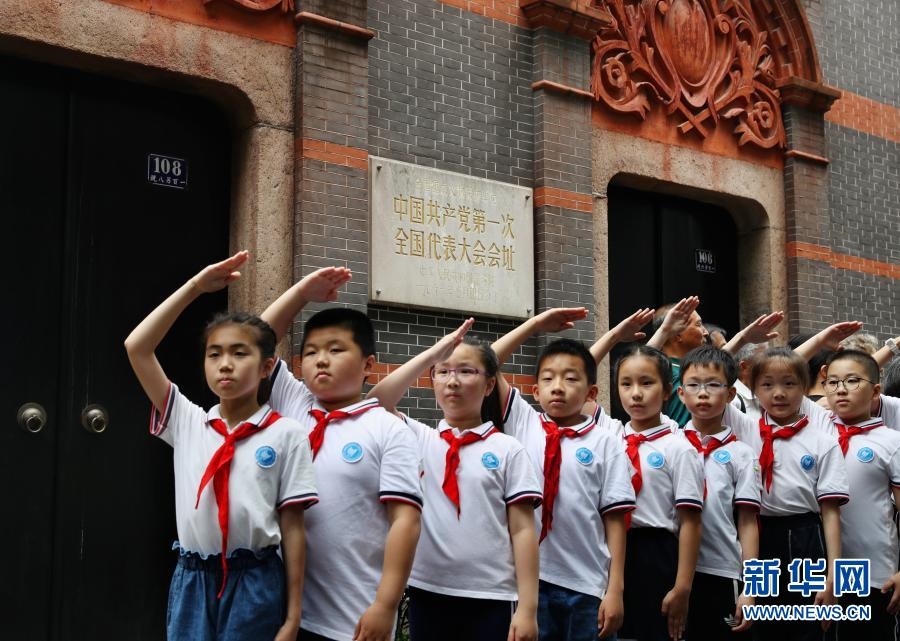 在中共一大會址前,上海市復(fù)旦萬科實驗學(xué)校的少先隊員們在參觀后合影留念(2019年6月27日攝)。新華社記者 劉穎 攝