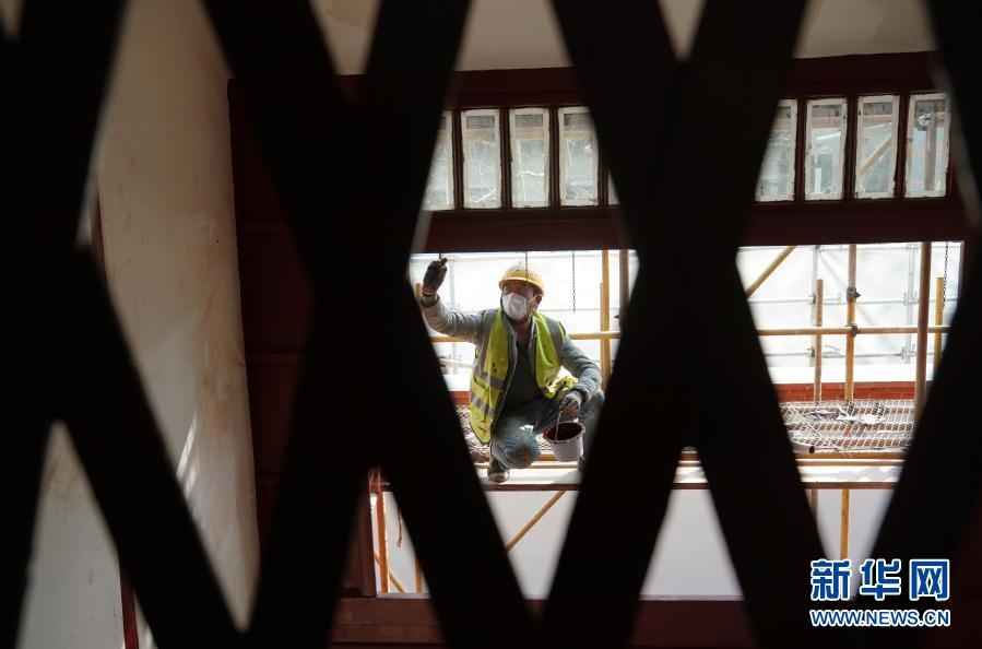 2021年1月14日,工人在修繕現(xiàn)場施工。2020年11月17日起,中共一大會址及原展廳暫停對外開放實施修繕改造。新華社記者 劉穎 攝
